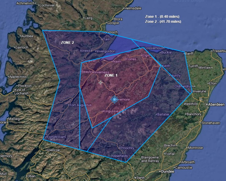 Zone 1 - up to 40 miles drive from my home in Aviemore.